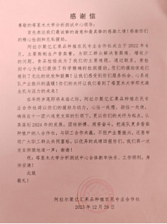 2024年1月2日,新一年工作日的第一天,分析测试中心收到阿拉尔聚亿汇果品种植农民专业合作社送来的《感谢信》。