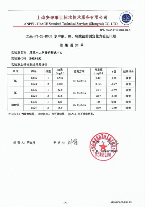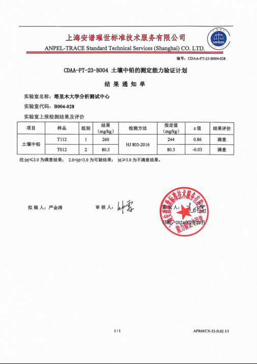 塔里木大学分析测试中心自成立以来,始终致力于提升检测技术和服务质量,此次能力验证的成功,不仅是对中心技术实力的肯定,也是对其严谨工作态度的认可。能力验证是检测机构质量控制的重要环节,通过与其他机构的对比测试,确保检测结果的准确性和可靠性。上海安谱璀世标准技术服务有限公司作为一家国内外知名的第三方检测认证机构,其验证结果具有高度的权威性。